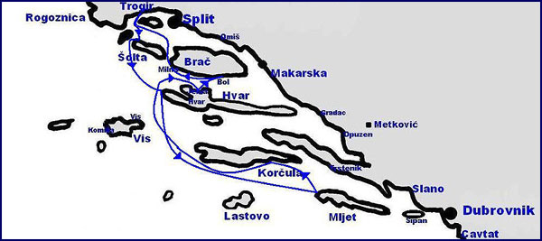 olta (Stomorska) - Hvar - Mljet - Korčula - Jelsa (Vrboska) - Bol - Milna - Trogir
